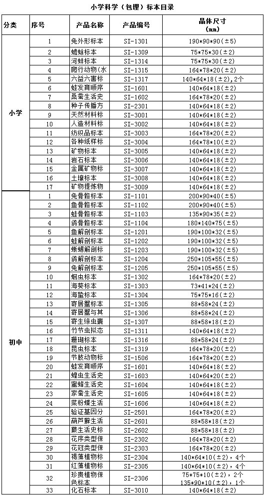 中小學(xué)標(biāo)準(zhǔn)配備系列包埋標(biāo)本涵蓋了國家中小學(xué)標(biāo)準(zhǔn)配備標(biāo)本要求的所有標(biāo)本品種,包括植物外形、植物生活史、植物結(jié)構(gòu)、動物外形、動物生活史、動物結(jié)構(gòu)、動物骨骼、動物解剖,礦物等標(biāo)本產(chǎn)品。產(chǎn)品符合國家教育部行業(yè)標(biāo)準(zhǔn)、企業(yè)標(biāo)準(zhǔn)、以及行業(yè)通行的安全標(biāo)準(zhǔn),與教學(xué)大綱緊密配套,是中小學(xué)自然生物課堂的直觀教材和先進(jìn)教學(xué)用具。